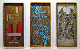 Der Ausstellung tut der Reiz des Unbekannten gut und die formale Stringenz der Objekte, die alle in Holzkästen aus der 2017 aufgelösten Lahrer Traditionsfirma Skrebba eingefügt sind. Das immer gleiche rechteckige Format, der schmale Rahmen und die sichtbaren Alterungsspuren haben die Künstlerinnen und Künstler inspiriert zu Objekten und malerischen Umgestaltungen, die minimalistisch sein können oder überbordend. Manches Werk ist für die Stammgäste der Galerie schnell einer Künstlerin, einem Künstler zuzuordnen, anderes wirft Fragen auf.“