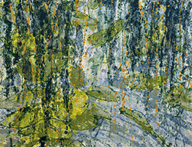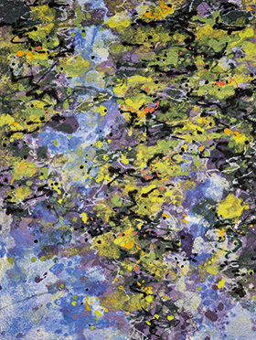 Die ausgestellten Werke sind in einer speziellen Technik hergestellt: Pulpemalereien. Dabei wird pigmentierte flüssige Papierpulpe auf handgeschöpftes Papier gegossen, gespritzt, getröpfelt. Die subtile Schönheit der Natur verwandelt sich in abstrakt-gestische Malerei.