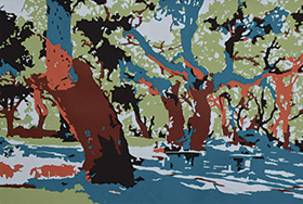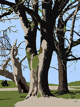 Große, alte Bäume waren für Heinz Kneile ab den späten 50er Jahren Motive künstlerischen Arbeitens. Bei Lahrer Waldspaziergängen entdeckte er weitere Motive, so etwa am Philosophenweg die Platanengruppe und die Robinson-Buche, oder auf dem Langenhard die uralte Eichenruine. Ähnliche Motive kamen bei Urwaldbesuchen hinzu.