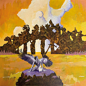 „Äußere und innere Welten u?berschneiden sich in symbolischen Gesten und der Darstellung von Tiermenschen, in Landschaftsstrukturen, Bäumen, Bu?schen und Gebäuden, die rätselhaft wirken, einer fiktiven Traumwelt entsprungen scheinen. (…)