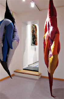 AUSSTELLUNG11.03.2011 - 16.04.2011Regine Staudenmeyer-Türck Neue Objekte Vernissage: Freitag, 11. März 2011, um 19 Uhr Seit 2008 arbeite ich an einer Reihe von Objekten, die ich aus Stoffen nähe. Es entstehen sowohl Reliefobjekte als auch vollplastische Objekte. Oft beziehe ich andere Materialien sowie Bemalung mit ein. Das sagt die Presse: Der Aufenthalt in den von solchen Gebilden ausgefüllten und beherrschten Räumen suggeriert die irritierende Präsenz einer Anwesenheit in Traumsituationen: Man ist darin und will sie doch als wahr bestreiten. (...) Die verschiedenen Volumina der Körper sind quasi auch Ergebnisse des Umfangs eines "Einatmens" äußerer Wirkungen, beziehungsweise des verhaltenen Atems in selbstbezüglicher Knappheit der Kommunikation. (...) Aufgeplatzte Nähte formulieren Gefährdung des Systems. Schlauchartig sind manche Objekte verbunden und umwunden und drücken so das Fließen intuitiver Ströme zwischen den Körpern aus, die sich schließlich wie Tentakel den Raum erobern. (...) Wahrnehmungsformen alltäglicher Dinge in ihrer Qualität der Schärfung unserer Sinne für das Stoffliche und seiner existenziellen Bezüge zu unserem Leben. Georgis Zwach in der Badischen Zeitung, 21. März 2011 Zurück |