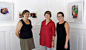 ![]() Grundschüler der Eichrodtschule in Lahr haben im Rahmen der diesjährigen Projekttage farbenfrohe Wachscollagen kreiert. Das Foto zeigt die Projektleiterinnen Ute Alexander (links) und Adelheid Wagner (rechts) sowie die Ausstellungspatin Renate Henninger (Mitte). |