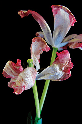 Dieter Weißenbergers Fotografien machen Schönheit sichtbar – genauer die Schönheit der Vergänglichkeit. Denn die Tulpen, die sie zeigen, sind alle im Stadium des Welkens und Vergehens. Die Pracht der Blüten und ihre fragile Hinfälligkeit liegen nah beieinander – so nah, dass man bei ihrem Anblick gar nicht an das Ende denken mag. Denn sie wirken voller Leben: Ihre Farben leuchten vor dem dunklen Hintergrund und ihre gestisch-expressiven Formen werden durch Licht und Schatten verführerisch inszeniert.